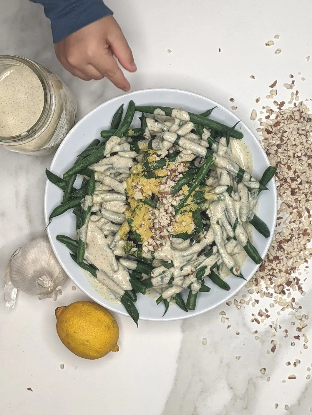 - Drizzle the sauce over the beans and sprinkle with more almonds and nutritional yeast if you want.